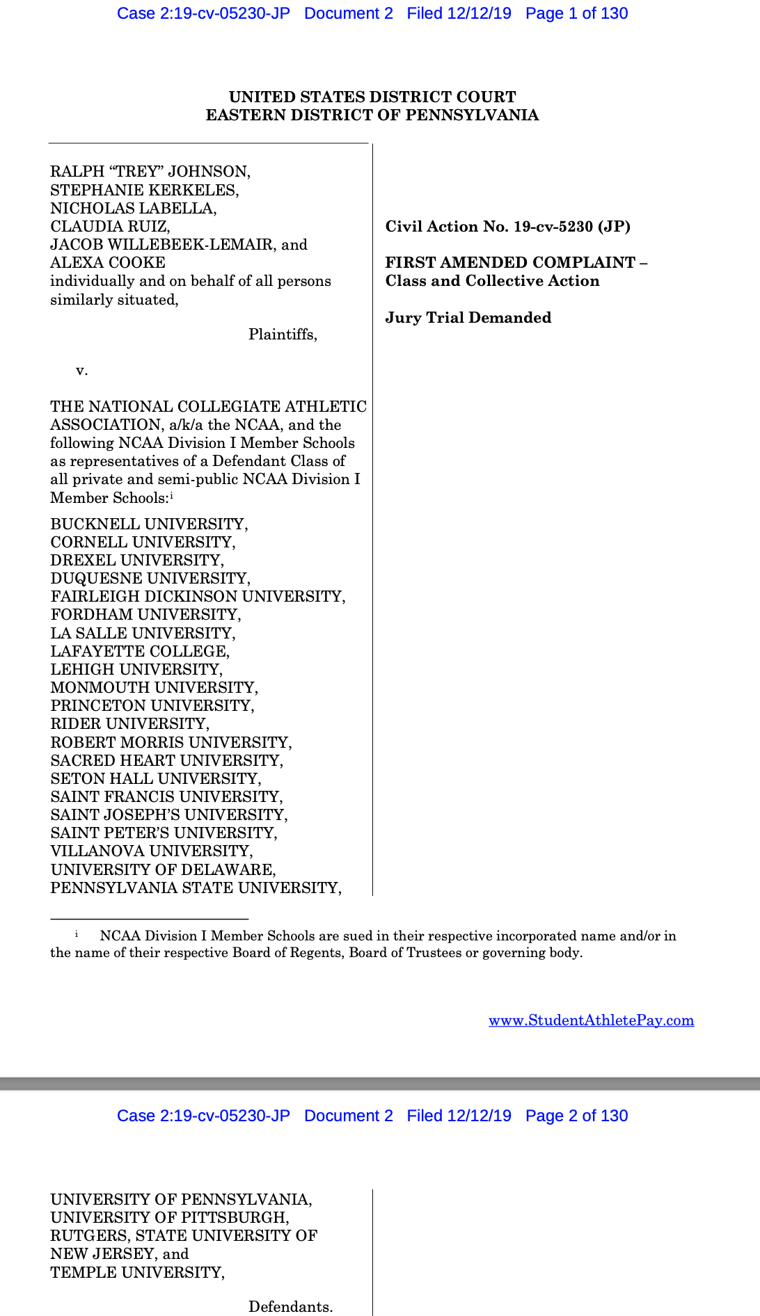 2019 (December 12th) - A group of athletes from non-FBS schools (lower-level Division I) file a federal class-action lawsuit—Johnson v. NCAA—against the NCAA and schools claiming hourly wage benefits under the Fair Labor Standards Act (FLSA); athletes must first prove they are employees with the meaning of the FLSA; suit directly challenges the NCAA’s conceptualization and use of the “student-athlete”; athletes also allege that the NCAA is a “joint employer” with the schools making the NCAA liable under the Act