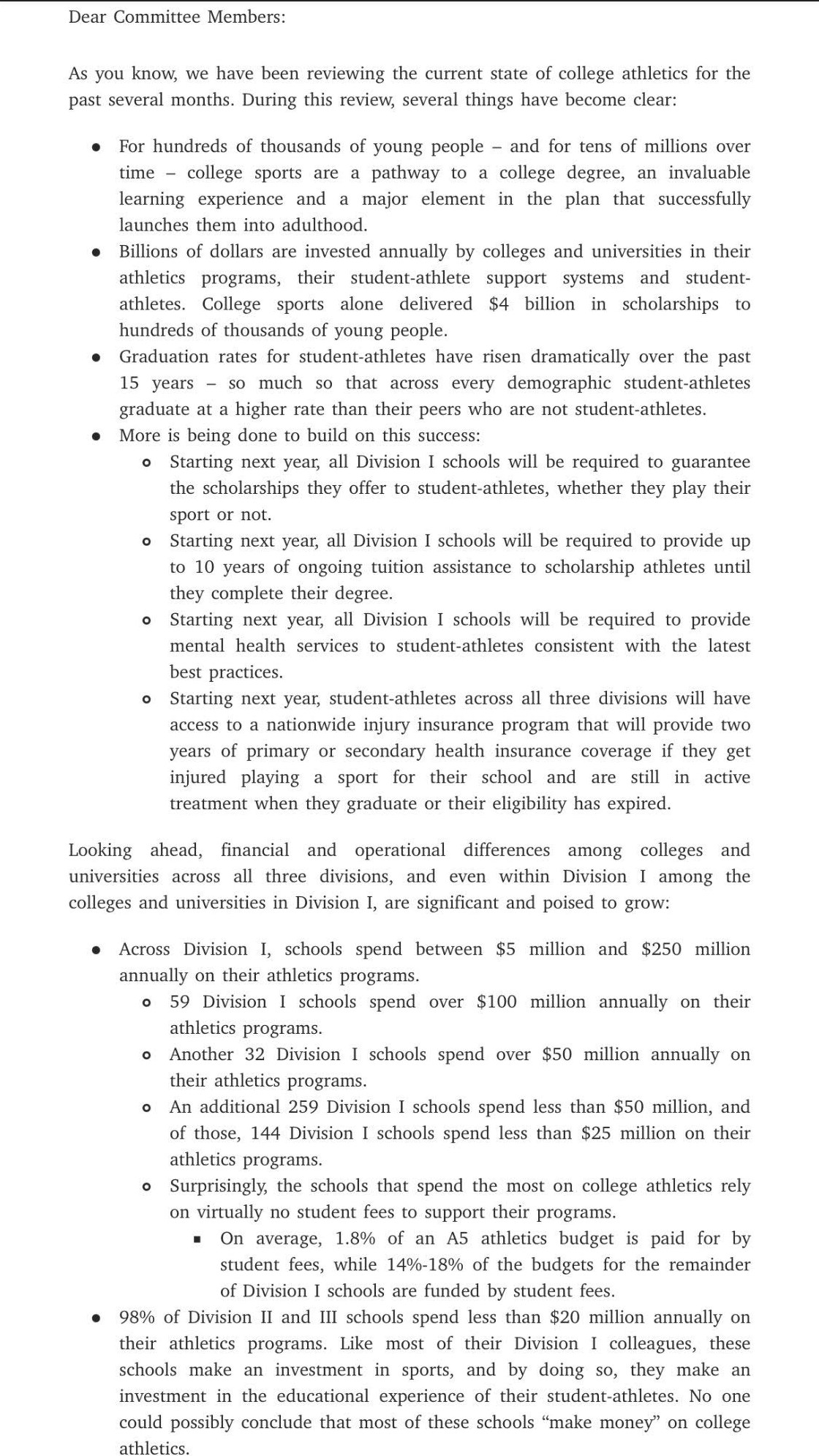 2023 (December 5th) - NCAA President releases a letter to Division I committee members suggesting the creation of a new Division for top-tier, “highest resource” schools; these schools could invest at least $30,000 per year (for at least half of the school’s eligible athletes) into an “enhanced educational trust fund” for equal distribution to athletes consistent with Title IX; the letter also suggests that schools may be able to pay athletes directly for their NIL through group licensing deals (similar in theory to the remedy athletes seek in the House lawsuit); the letter is viewed as a ground-breaking shift in NCAA philosophy and policy on amateurism-based compensation limits; Baker did not address the timing of the letter; subsequent events suggest the NCAA and Power 5 needed to show Congress they were capable of making menaingful voluntary changes before receiving protections from Congress (see January 13th entry below); attorneys for athletes in the Carter suit filed on December 7th (see below) incorporate Baker’s letter into their complaint suggesting it is an admission that the NCAA has abandoned its amateurism-based compensation limits; notably, Baker’s letter says the new benefits “provides an operating model the NCAA and its member institutions can incorporate into ongoing discussions with Congress about the future of college sports”; Greg Sankey suggests he was not aware of the letter and expresses displeasure with Baker’s alleged exclusion of stakeholders (December 7th entry below)